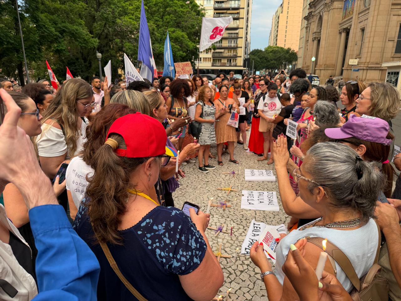 A Themis participou, na noite desta quarta-feira (28/01), da Vigília pelo Fim dos Feminicídios no Rio Grande do Sul, realizada na Praça da Matriz, em Porto Alegre. O ato reuniu centenas de pessoas em um momento coletivo de memória, denúncia e mobilização contra a violência que atinge mulheres e meninas em todo o estado. Com velas acesas e falas de indignação e solidariedade, a vigília reforçou a necessidade de não naturalizar os assassinatos de mulheres em razão de gênero.