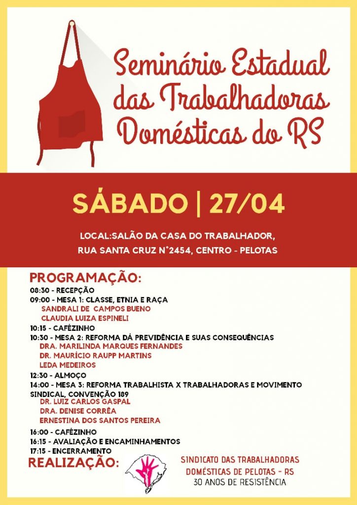 No próximo sábado (27) ocorre o Seminário Estadual das Trabalhadoras Domésticas, na Casa dos Trabalhadores Domésticos de Pelotas (R. Santa Cruz, 2454 – Centro, Pelotas – RS). O tema do seminário deste ano é “Trabalho Doméstico: Gênero, Raça, Classe e Reformas”. A THEMIS – Gênero, Justiça e Direitos Humanos será representada por duas Promotoras Legais […]
