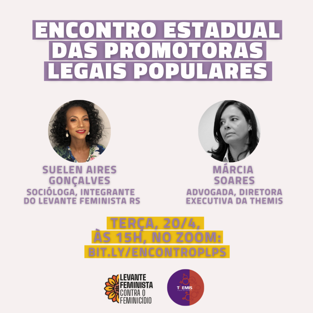 A Themis convida as Promotoras Legais Populares do Rio Grande do Sul para participar do Encontro Estadual das PLPs, na terça-feira, 20 de abril, às 15h. A atividade será realizada online, por meio de aplicativo zoom, por meio do link bit.ly/encontroPLPS. O objetivo do encontro é conversar sobre a organização das PLPs e a articulação […]