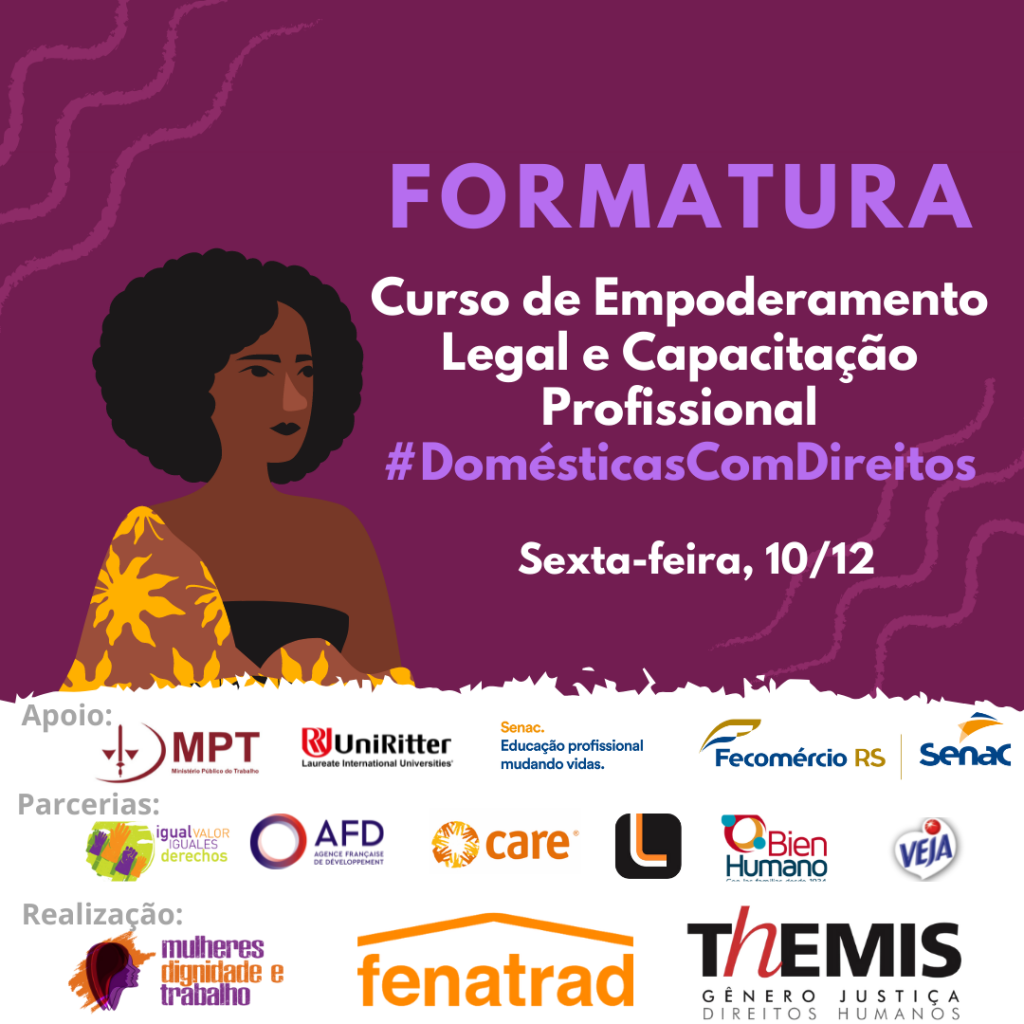 Na próxima sexta-feira, 10 de dezembro, a Themis e a Federação Nacional das Trabalhadoras Domésticas (Fenatrad) realizam a formatura das trabalhadoras que realizaram o curso de Empoderamento legal e Qualificação profissional, iniciado em setembro. O evento será realizado online, pelo Zoom, com formandas de todo o país. Ao longo dos últimos meses, faxineiras, cozinheiras, diaristas, […]