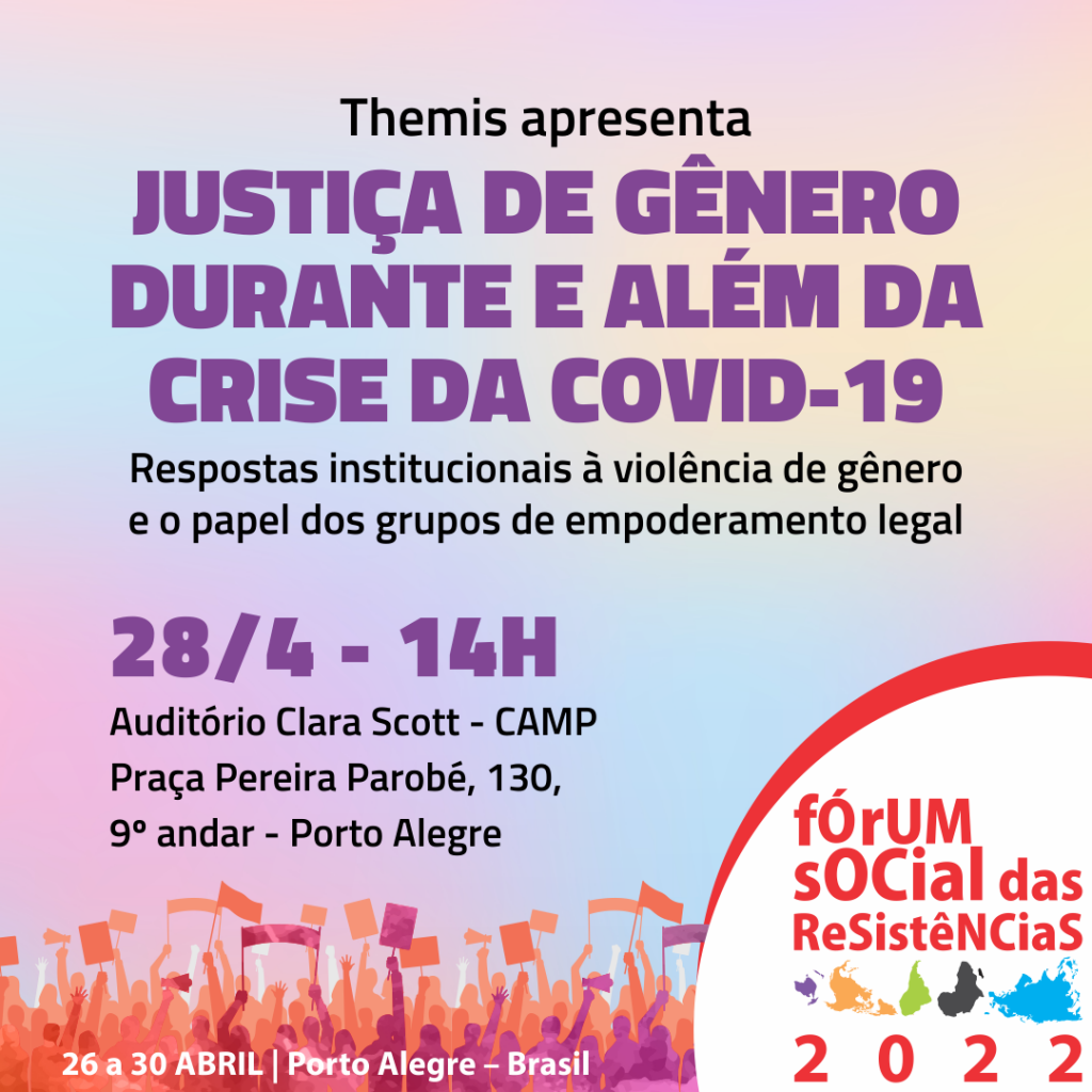 A Themis – Gênero, Justiça e Direitos Humanos realizará uma atividade sobre justiça de gênero no Fórum Social das Resistências, eixo do Fórum Social Mundial que ocorrerá em Porto Alegre nesta semana. Na quinta-feira (28/4), às 14h, a organização apresentará a pesquisa “Justiça de gênero durante e além da crise da Covid-19: respostas institucionais à […]