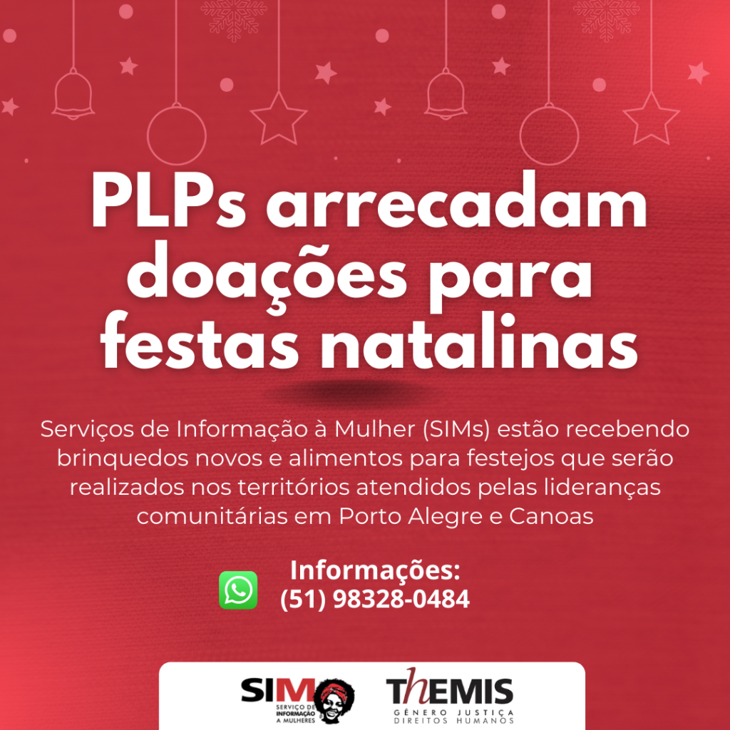 Promotoras Legais Populares (PLPs) estão preparando festas de Natal e/ou entrega de brinquedos para crianças e mulheres vítimas de violência atendidas pelos Serviços de Informação à Mulheres (SIMs), em Porto Alegre e Canoas. Para que os festejos se concretizem, é necessária a ajuda da comunidade. Por isso, está sendo feita a arrecadação de presentes (brinquedos […]