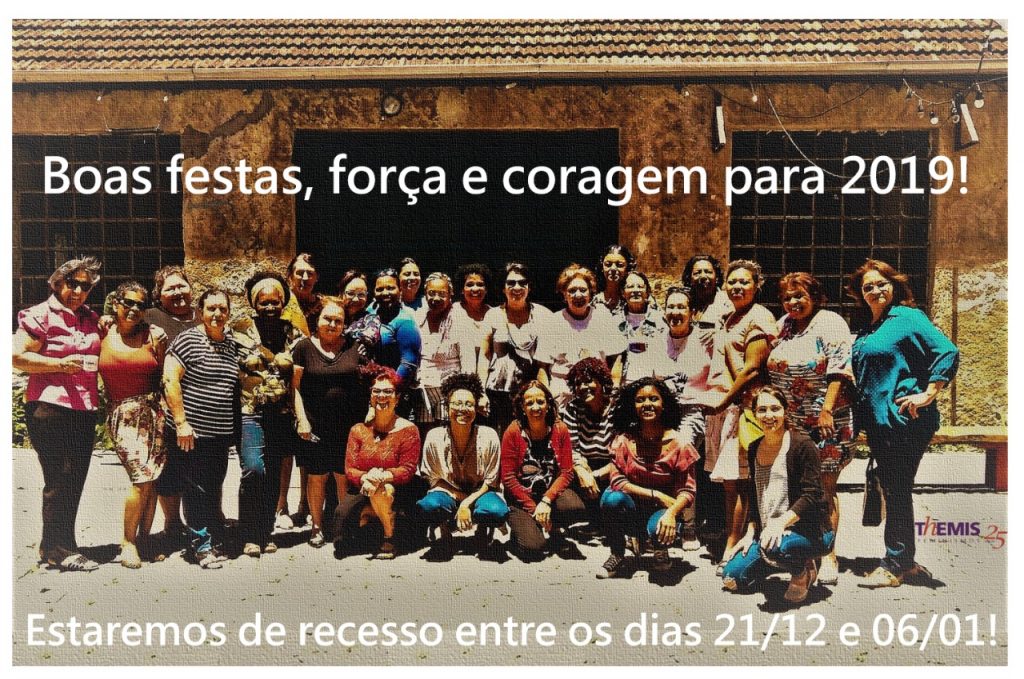 A Themis – Gênero, Justiça e Direitos Humanos estará de recesso do dia 21/12 até 06/01. Retornamos dia 07/01. Boas festas, força e coragem para 2019.