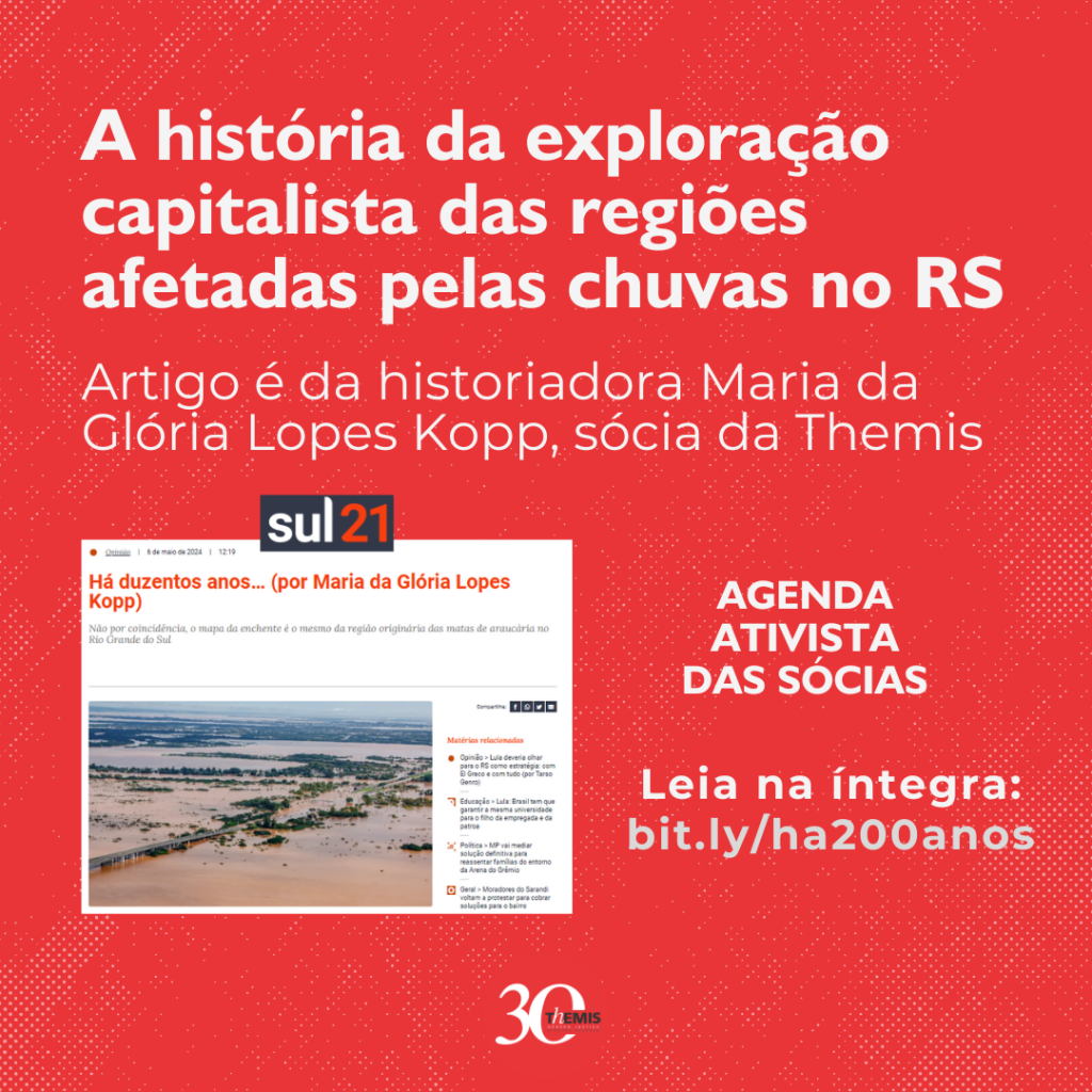 A historiadora Maria da Glória Lopes Kopp, sócia da Themis, escreveu um artigo para o jornal Sul21 sobre a história da exploração capitalista das regiões afetadas pela tragédia climática do Rio Grande do Sul. “Não por coincidência, o mapa da enchente é o mesmo da região originária das matas de araucária. A intensa atividade econômica […]