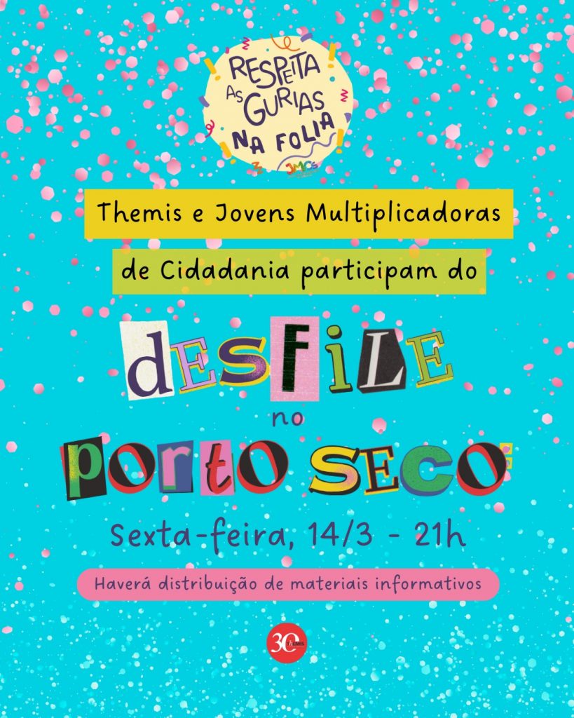 A terceira edição da campanha “Respeita as gurias na folia – Juntes por um Carnaval sem assédio”, promovida pelas Jovens Multiplicadoras de Cidadania (JMCs) da Themis, foi encerrada com uma ação no Porto Seco, durante o desfile das escolas de samba de Porto Alegre, na noite da última sexta-feira (14/04). JMCs e Promotoras Legais Populares […]