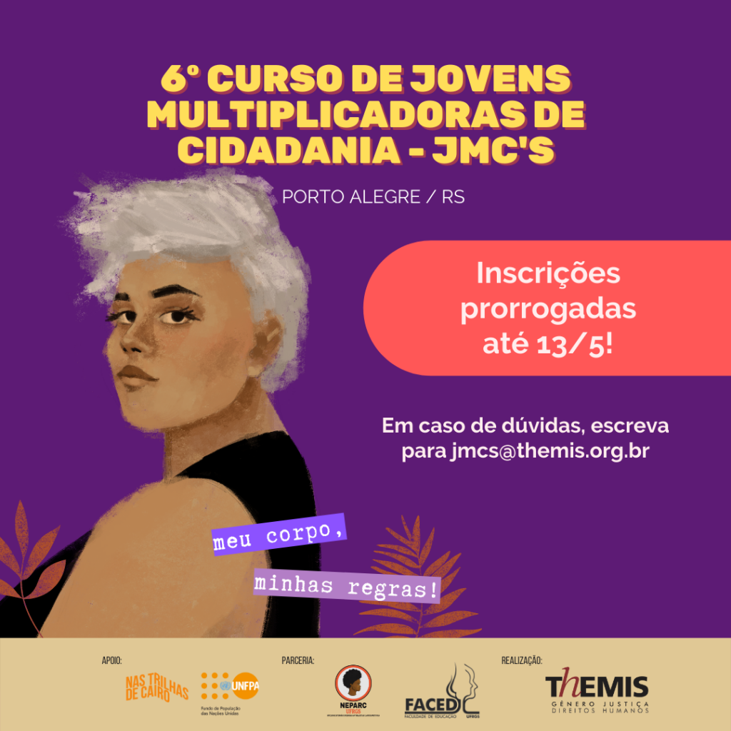 As inscrições para a 6º Formação de Jovens Multiplicadoras de Cidadania, promovido pela Themis – Gênero, Justiça e Direitos Humanos, foram prorrogadas até a sexta-feira (13/5). O curso de formação jurídico-feminista é destinado a jovens moradoras da periferia de Porto Alegre, com idade entre 15 e 20 anos, que desejam qualificar e fortalecer seu protagonismo, […]