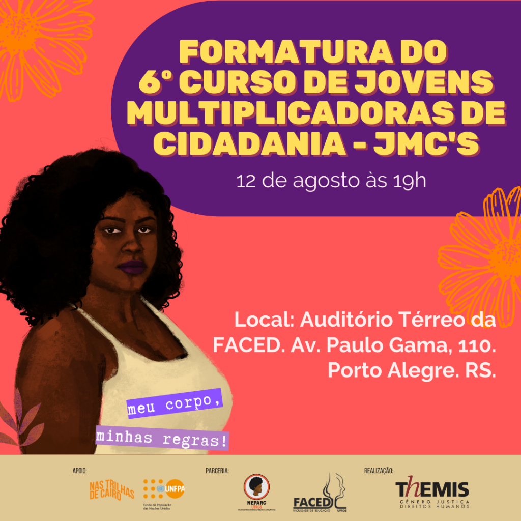 Esta sexta-feira (12), Dia Internacional da Juventude, marca a formatura da 6ª turma do Curso de Formação de Jovens Multiplicadoras de Cidadania (JMC’s). A celebração ocorrerá a partir das 19h no auditório (sala 102) da Faculdade de Educação da Universidade Federal do Rio Grande do Sul, na Av. Paulo Gama, 110, bairro Farroupilha, em Porto […]