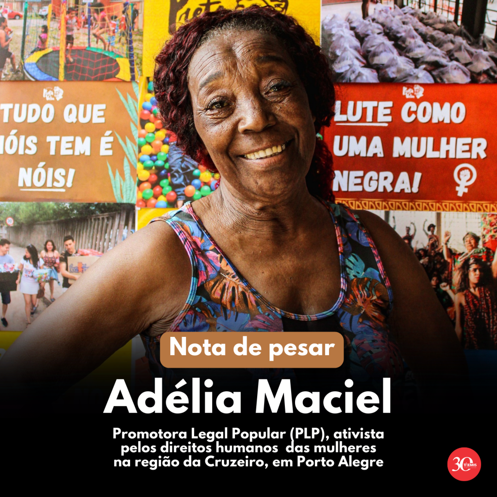 A Themis e toda sua equipe lamentam profundamente o falecimento da Promotora Legal Popular (PLP) e companheira de lutas Adélia Maciel. Se solidariza com os filhos, netos e amigos, e agradece sua imensa contribuição em defesa dos direitos humanos das mulheres na região da Cruzeiro, na Capital Tia Adélia foi uma mulher muito querida pela […]
