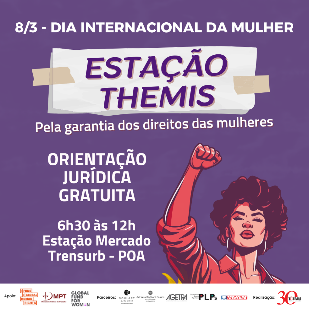 A Themis – Gênero, Justiça e Direitos Humanos promove nesta sexta-feira, Dia Internacional da Mulher, a Estação Themis, sua tradicional ação de orientação jurídica gratuita para mulheres na Estação Mercado do Trensurb. Haverá participação da Defensoria Pública do Estado (DPE), da Associação Gaúcha da Advocacia Trabalhista (AGETRA), do GATRA – Serviço de Assessoria Jurídica Universitária […]