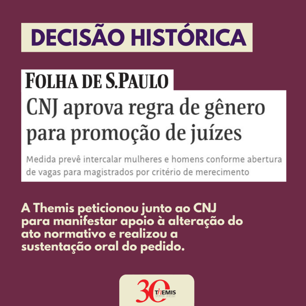 Em uma decisão histórica, o Conselho Nacional de Justiça (CNJ) aprovou na terça-feira (26) uma proposta para aumentar a quantidade de mulheres magistradas na segunda instância da Justiça. A Themis e a Plataforma Justa, em parceria com o Fórum Justiça e o Grupo de Estudos em Direito, Democracia e Desigualdades, da Faculdade de Direito de […]