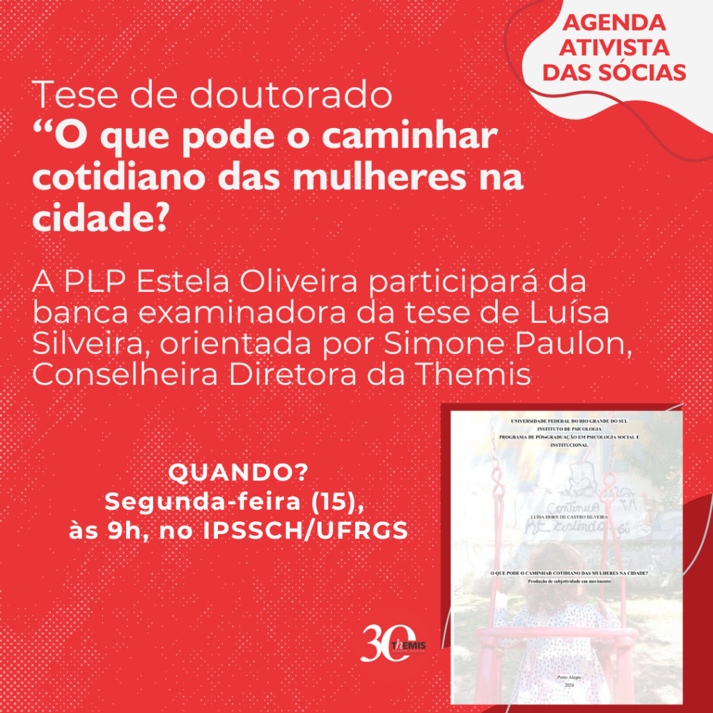 Nesta segunda-feira (15), a Promotora Legal Popular (PLP) Estela Oliveira participará de uma importante atividade na Universidade Federal do Rio Grande do Sul (UFRGS). Formada pela Themis, Estela foi convida para compor a banca examinadora da tese de doutorado intitulada “O que pode o caminhar cotidiano das mulheres na cidade? Produção de subjetividade em movimento”, […]