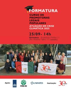 A Themis – Gênero, Justiça e Direitos Humanos, em parceria com a Universidade do Vale do Taquari (Univates) e a Federação dos Trabalhadores na Agricultura no Rio Grande do Sul (Fetag), realiza nesta quinta-feira, 25 de setembro, a formatura de 28 mulheres no Curso de Promotoras Legais Populares (PLPs) com foco em situações de crise climática. A cerimônia acontece às 14h, no Auditório da Univates.