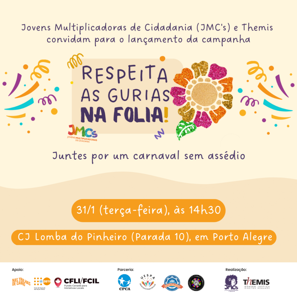 Carnaval é sinônimo de diversão e alegria, mas é durante a maior festa do país que também se intensificam os casos de assédio sexual e de Infecções Sexualmente Transmissíveis (ISTs). Pensando nisso, a Themis – Gênero, Justiça e Direitos Humanos, por meio do seu programa Jovens Multiplicadoras de Cidadania (JMC’s), promove a campanha “Respeita as […]