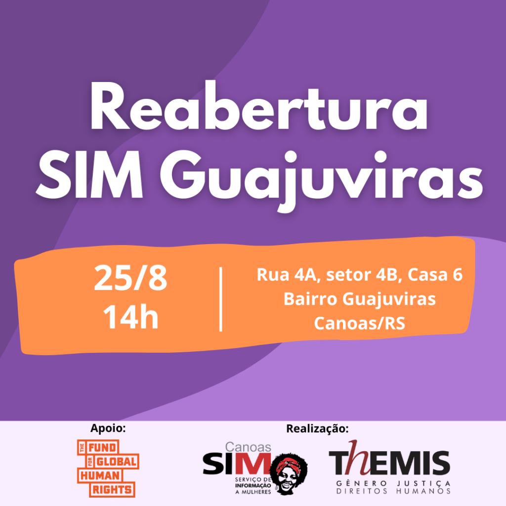Na próxima quinta-feira (25), às 14h, ocorre a abertura do Serviço de Informação a Mulheres (SIM) Guajuviras, em Canoas. O local, um importante espaço de acolhimento a mulheres vítimas de violência, fica na Rua 4A, setor 4B, Casa 6. Em Canoas, desde 2020, a Themis mantém Acordo de Cooperação com o Tribunal de Justiça […]