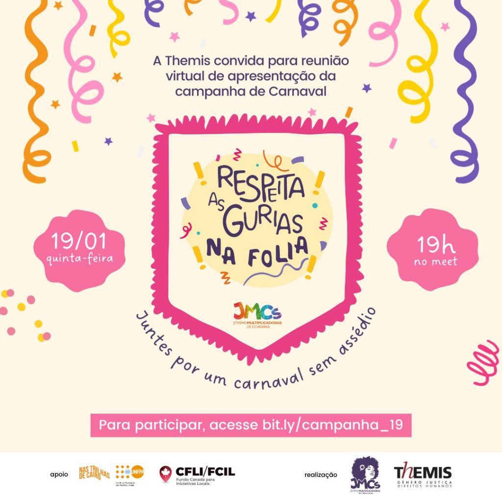 A Themis convida entidades e organizações parceiras e a comunidade carnavalesca para a apresentação virtual da campanha “Respeita as gurias na folia – Juntes por um Carnaval sem assédio”. A ação tem foco no público jovem e é realizada por meio do programa Jovens Multiplicadoras de Cidadania (JMC’s) da organização. Será nesta quinta-feira, (19/1), às […]