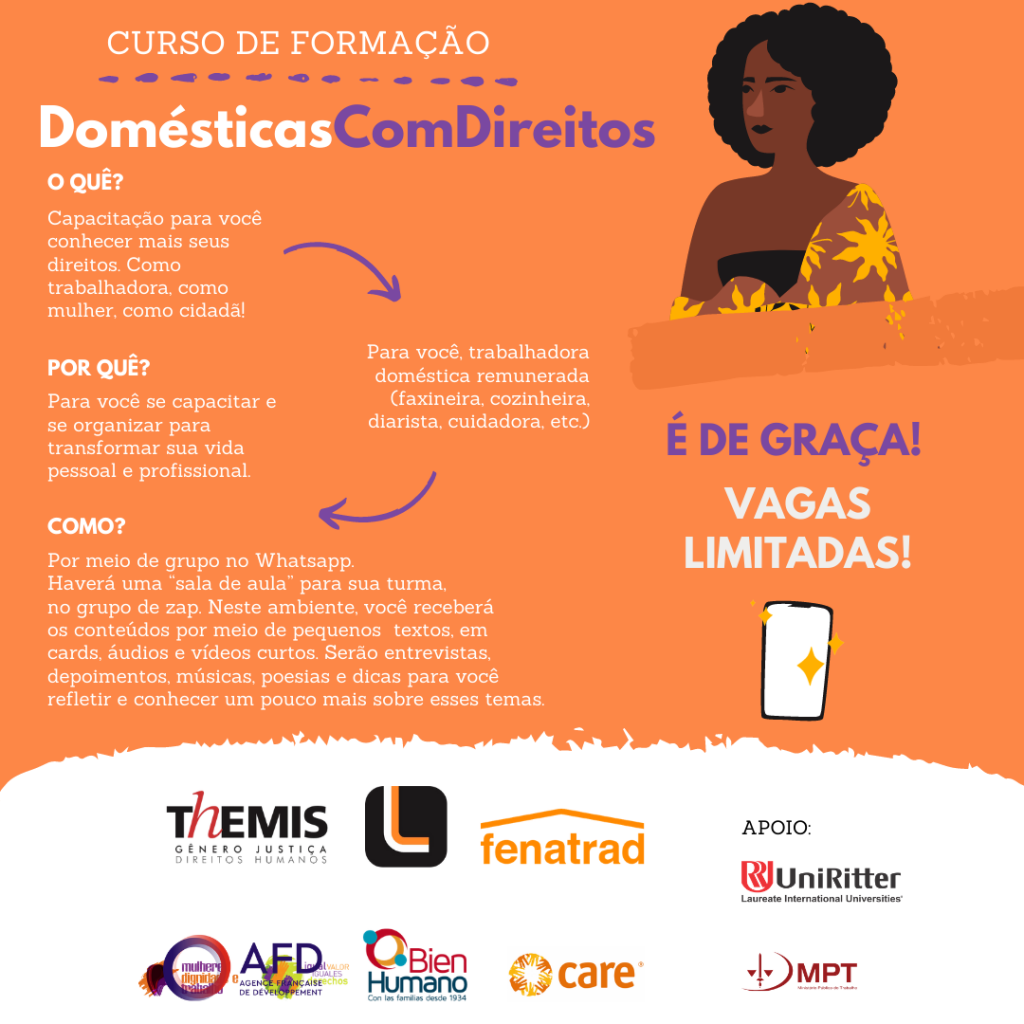 Em 27 de abril, data em que se celebra o Dia Nacional da Trabalhadora Doméstica, começam as aulas da segunda turma do Curso de Capacitação Profissional #DomésticascomDireitos, promovido pela Themis e pela Federação Nacional das Trabalhadoras Domésticas (Fenatrad). O curso, que tem o objetivo de capacitar faxineiras, cozinheiras, diaristas, cuidadoras e babás sobre trabalho decente, […]