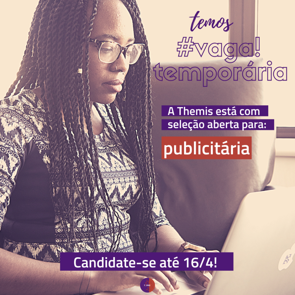 A Themis – Gênero, Justiça e Direitos Humanos abriu nesta terça-feira (13) seleção para a vaga temporária – três meses de duração – de publicitária. A profissional selecionada atuará em um projeto pontual da organização, que ocorrerá de abril a julho. Podem se inscrever mulheres com formação superior na área de Publicidade e Propaganda, […]